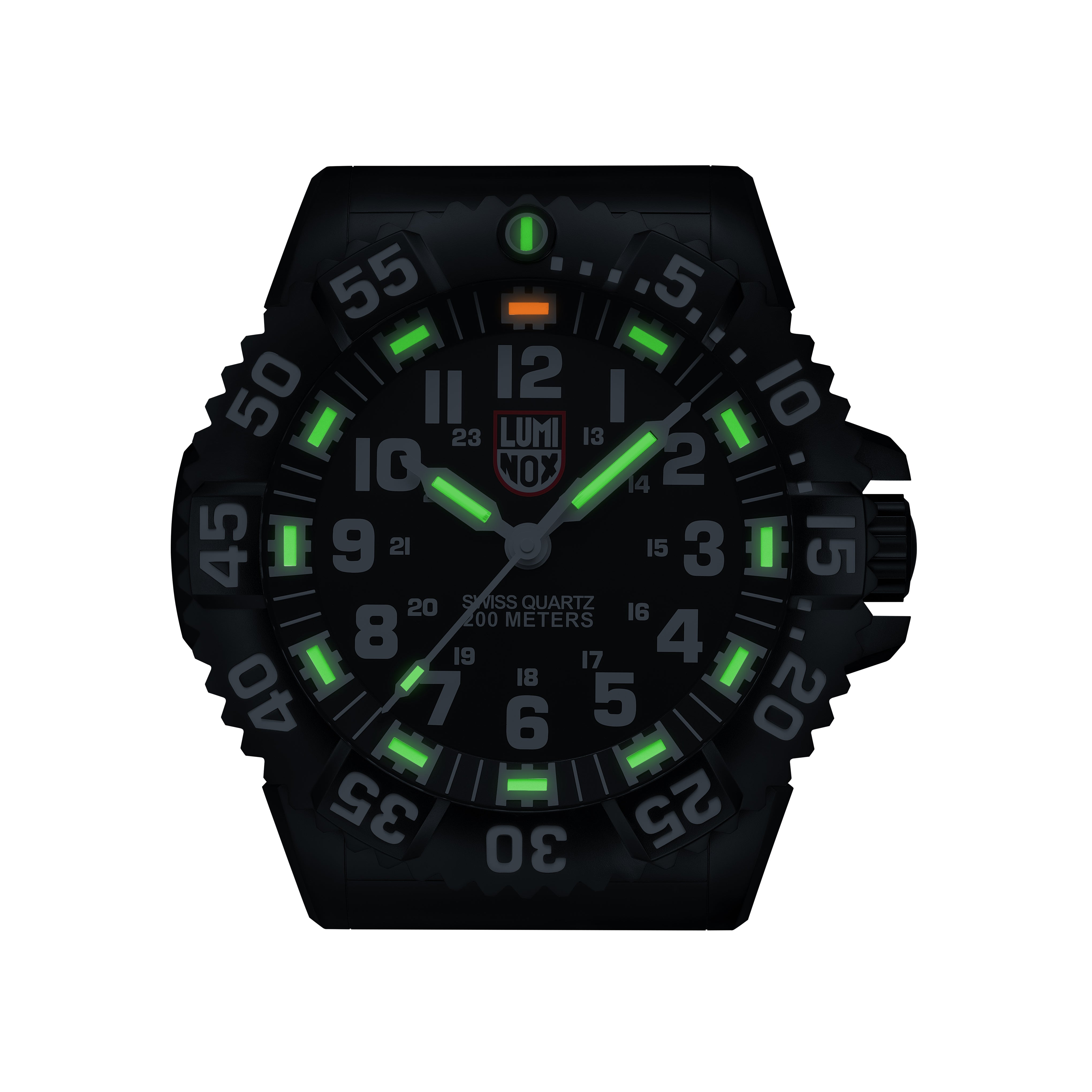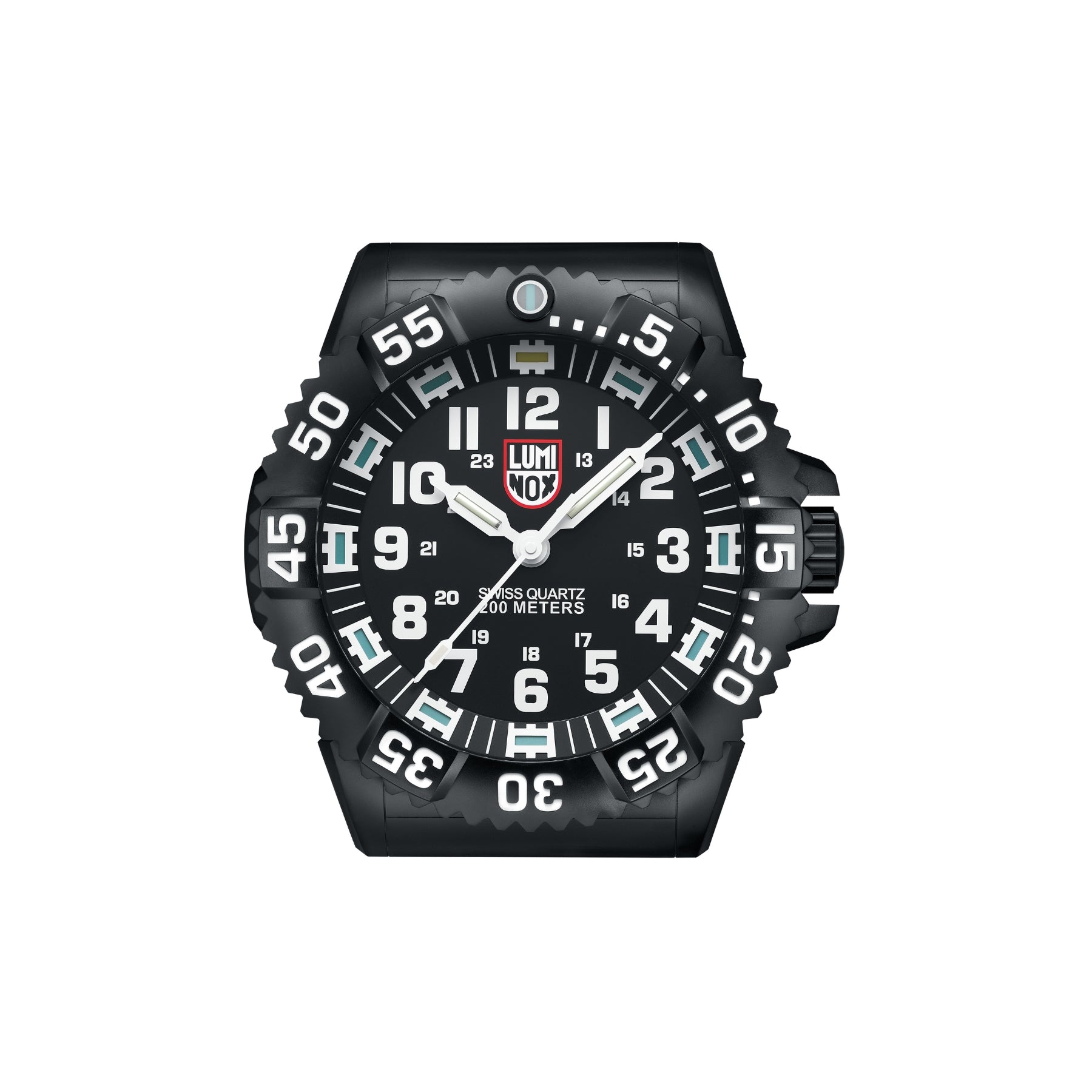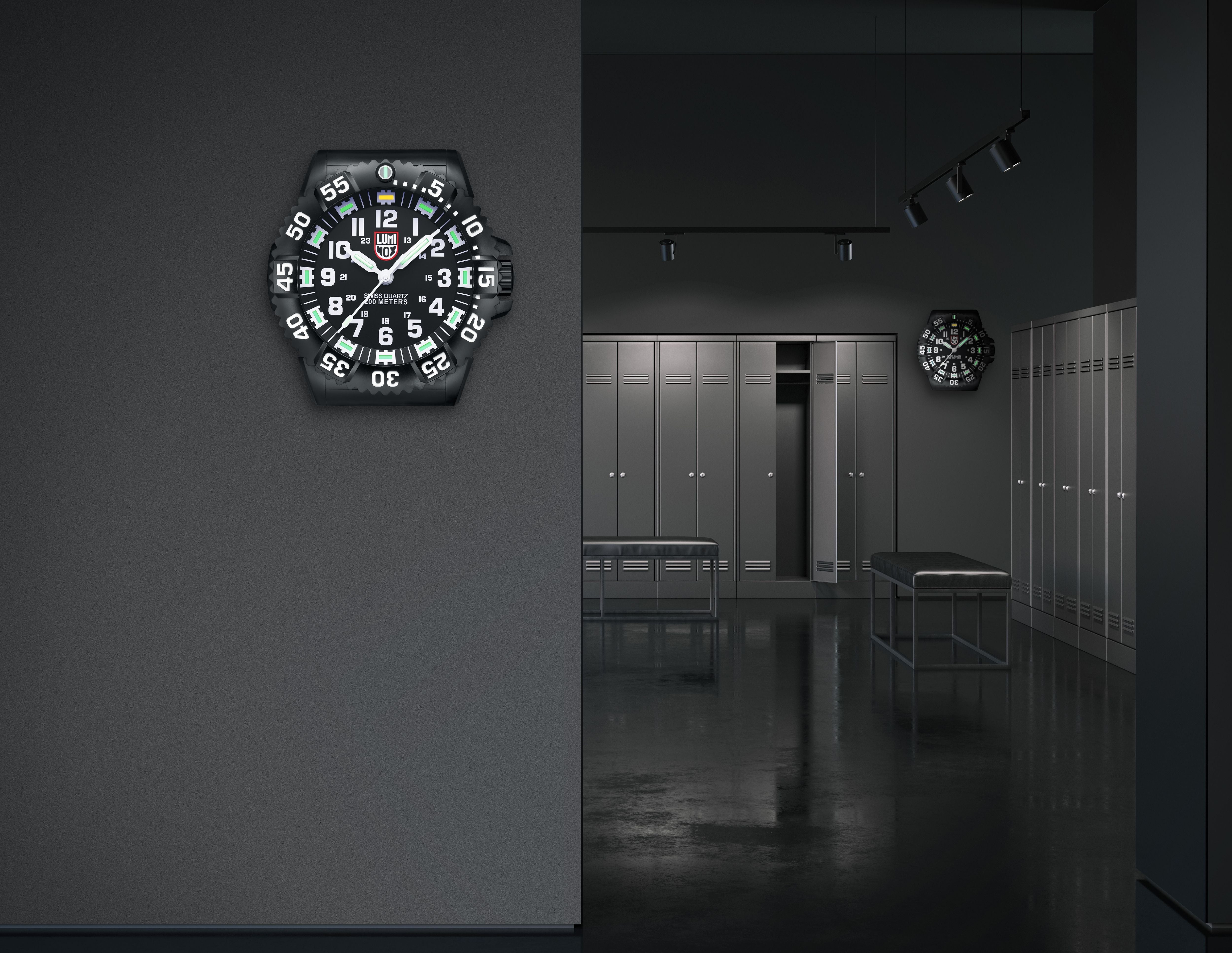 The Wall Clock is styled after the iconic Luminox turtle-shape case and has a diameter of 400 mm. The Wall Clock features colored LED lights on the hands, hour markings, and bezel evoking the look of the "Always Visible" lighting technology featured on all Luminox watches.